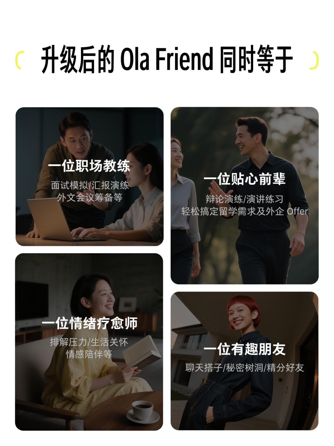 Ola Friend官方微信官方账号推文也强调,升级后的耳机也相当于:职场教练,涉及面试模拟、报告演练、外语会议准备;一个关心的前辈,涉及辩论演练、演讲训练、留学需求和外国公司的Offer;一个有趣的朋友和情绪治疗师…