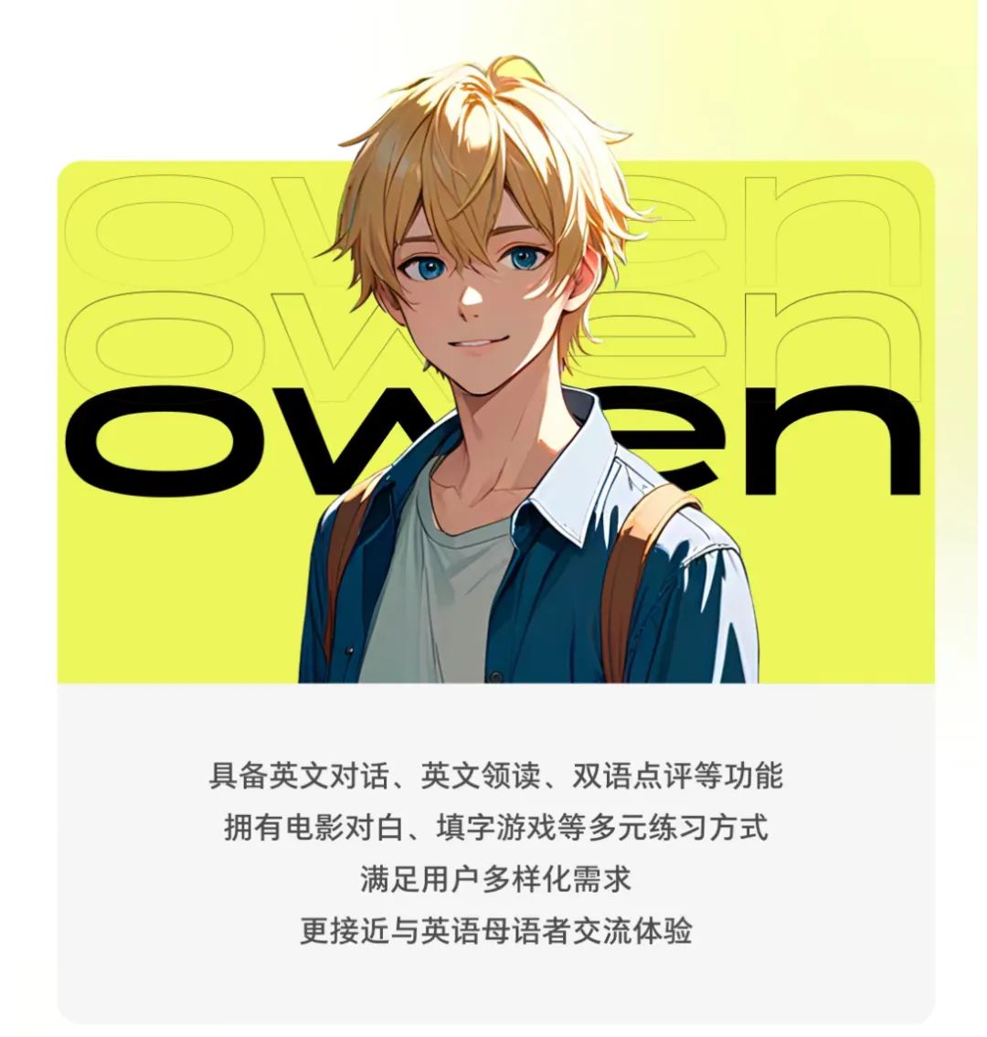 基于最新信息,本次能唤醒的英语外教智能体Owen具有英语对话、英语阅读、双语评价等功能;制定了电影对话、填写游戏等训练方法。