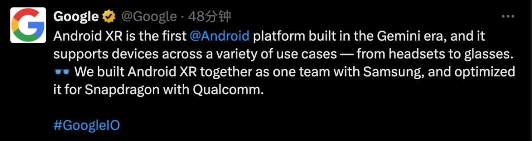 但 Android XR 地位完全不同。根据 Google 这是第一个措辞,这是第一个。 Gemini 时代搭建的 Android 平台。
