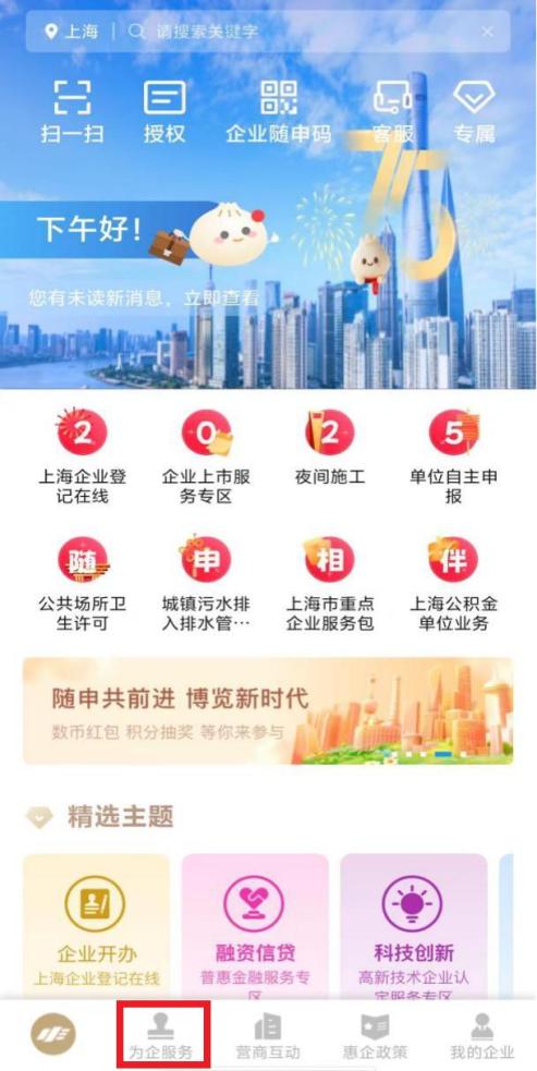 企业用户登录“随申办企业云”App,单击“为企业服务”;
