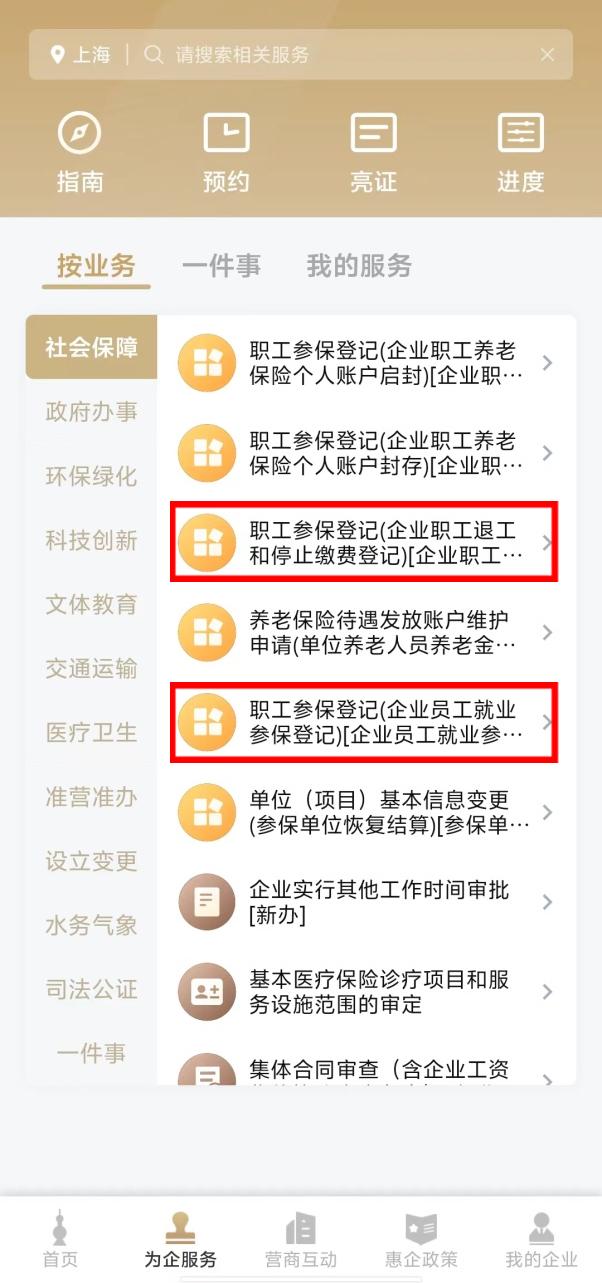 点击“员工参保登记[企业员工就业参保登记]或“员工参保登记[企业员工退工及停止缴费登记]”在“社会保障”频道;