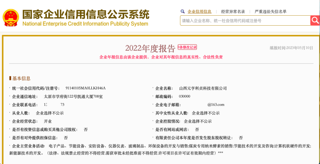 但是到目前为止,元亨利贞公司从2013年到2022年的年度企业报告信息还没有修改。2025年5月6日,石先生还收到太原市市场监管局的短信:“请业务主体登录中国企业信用信息公示系统完成年报”。