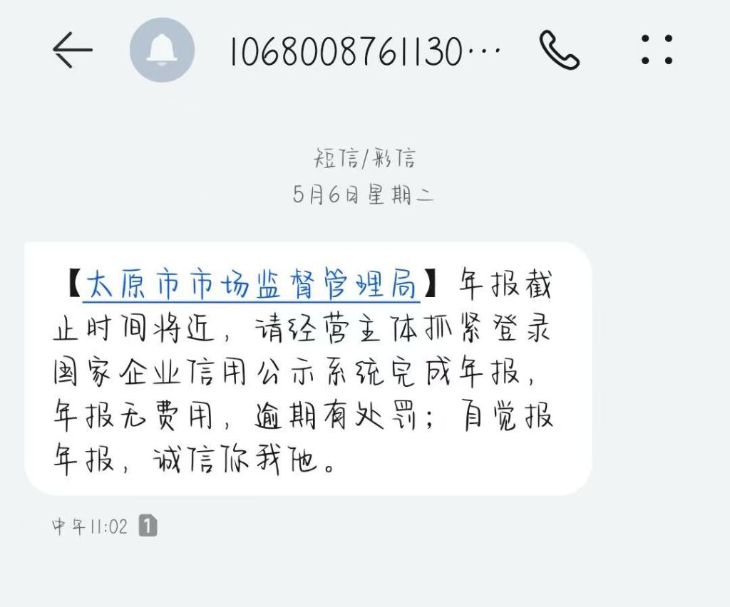 今年5月6日,石先生还收到了太原市市场监管局的业务查询提醒短信。受访者提供图片
