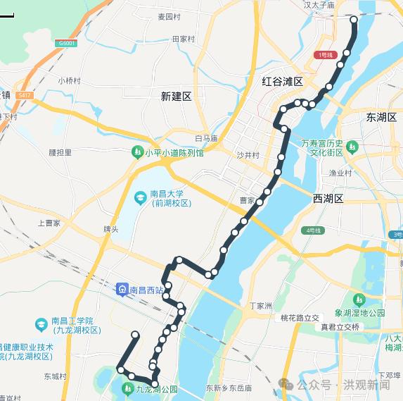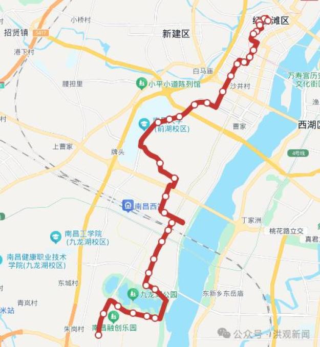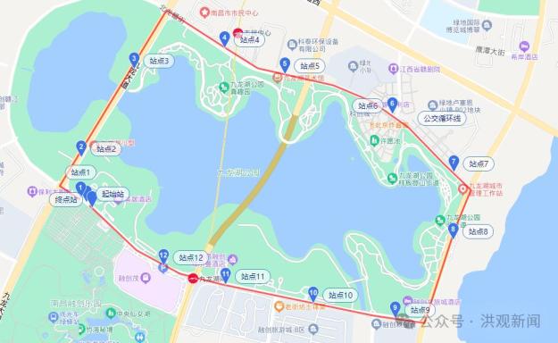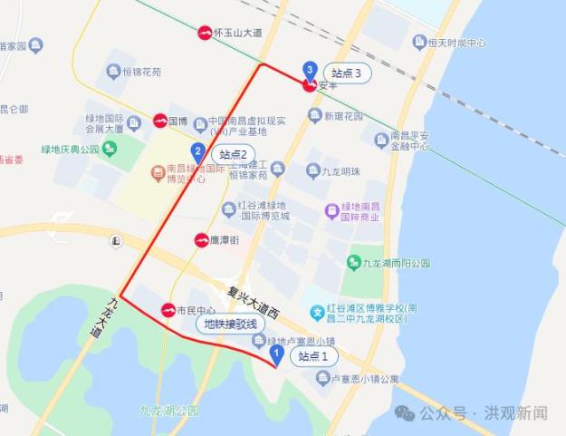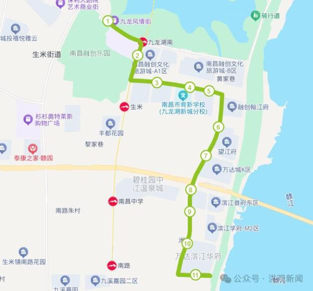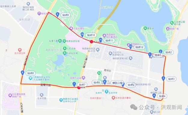 沿路网站:融创玖玺台(网站1)-南龙盘街赣江南大道口(网站2)-赣江南大道霞埠街口(网站3)-宜春街300山路口(网站4)-南昌育新学校九龙湖新城分校(网站5)-宜春街9连山路口(网站6)-生米地铁站(网站7)-万达文化旅游员工宿舍楼(网站8)-主题公园(网站9)-融创茂三号门(网站10)-九龙湖南地铁站东(网站11)-南龙盘街300山路口(网站12)