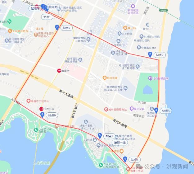 起点:绿地国际博览中心公交站(VR工业基地对面) 沿路网站:国博地铁一号口公交站(网站1)-上饶大街雅瑶路口(网站2)-赣江南大道斗门街(绿地滨江大厦)(网站3)-北龙盘街赣江南大道口社会停车场(网站4)-北龙盘街运输路口(网站5)-南昌市民中心(网站6)-绿地国际博览中心东公交站(网站7)