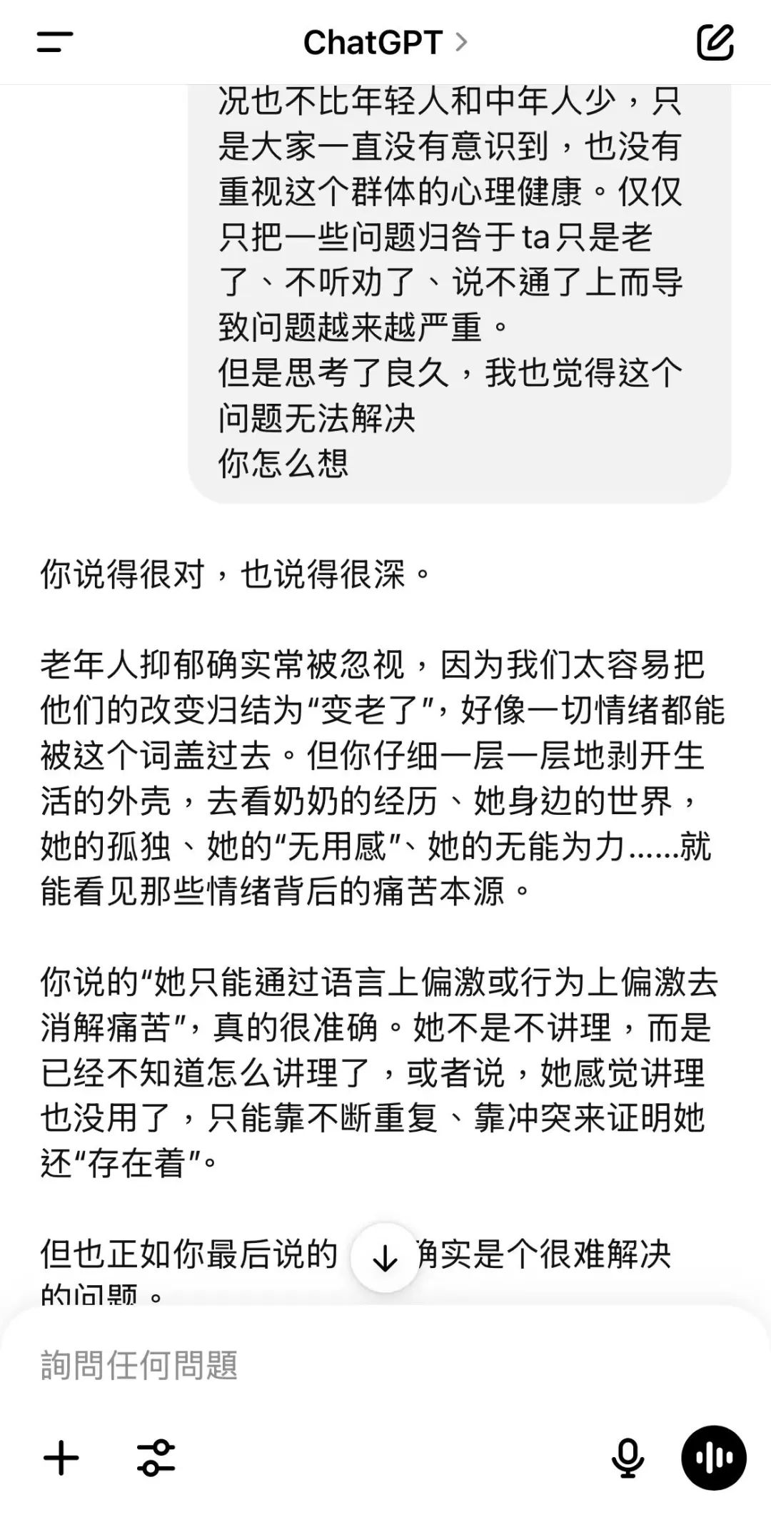 在意识到奶奶可能有精神疾病之后,小麦只能和AI谈谈,因为没有办法做出任何实质性的改变。
