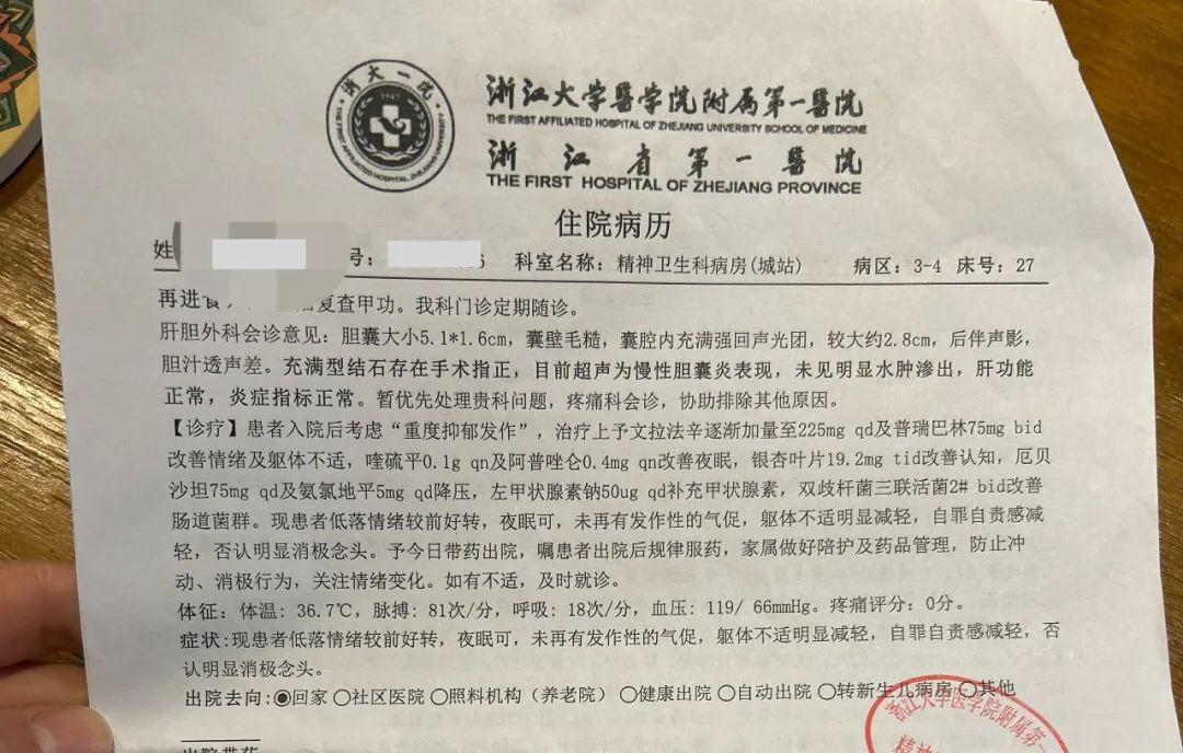 沃琳一直知道母亲有抑郁症,一开始陪妈妈去看宁波当地的医生,填写精神量表,结果是严重的抑郁症。