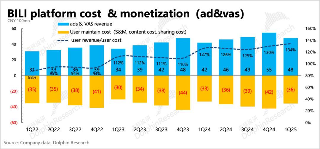 从海豚君一直观察的流量实现/成本关系来看,第一季度整体来看,单个客户流量实现带来的直接收益可以覆盖更多的内容和运维成本,说明实现效率继续小幅提升。