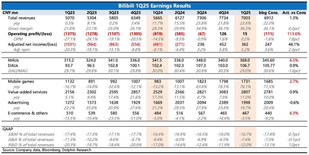 北京时间5月20日港股交易结束后,哔哩哔哩发布了2025年第一季度财务报告,实际表现小于预期。惊喜主要在于利润和客户指标。具体来说: