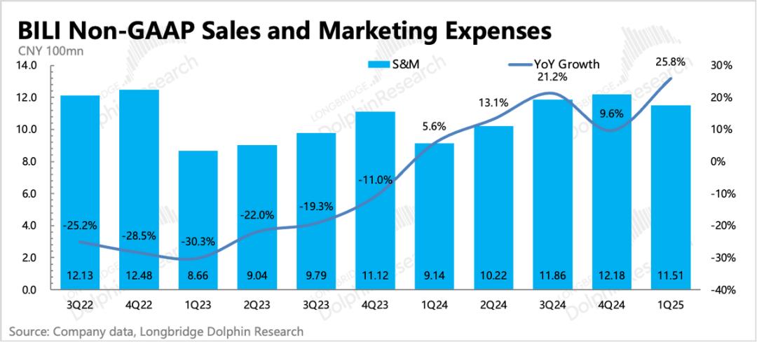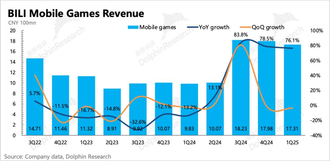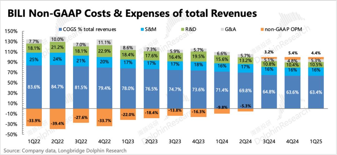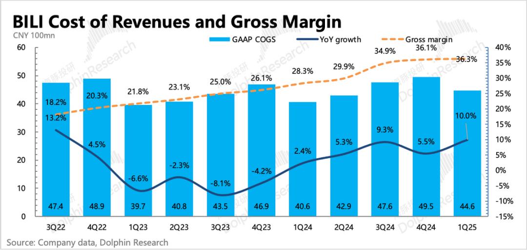 3. 广告业增长勉强达标:第一季度的广告增长符合引导的20%,但海豚君认为这种表现非常一般。考虑到流量超出预期的增长,以及哔哩哔哩高度匹配的隐藏游戏、AI等行业,第一季度的繁荣应该会带来更高的增长率。要么企业控制了载入率的释放,要么转化效果比同行差。
