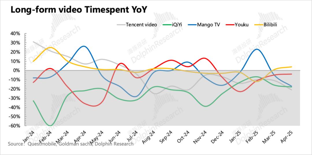 与传统的长视频平台相比,哔哩哔哩第一季度的增长甚至非常出色。在第一季度和4月份,除了芒果勉强依赖综艺节目和优酷依赖短期新剧之外,爱奇艺和腾讯视频的总时长都在双位数下降。