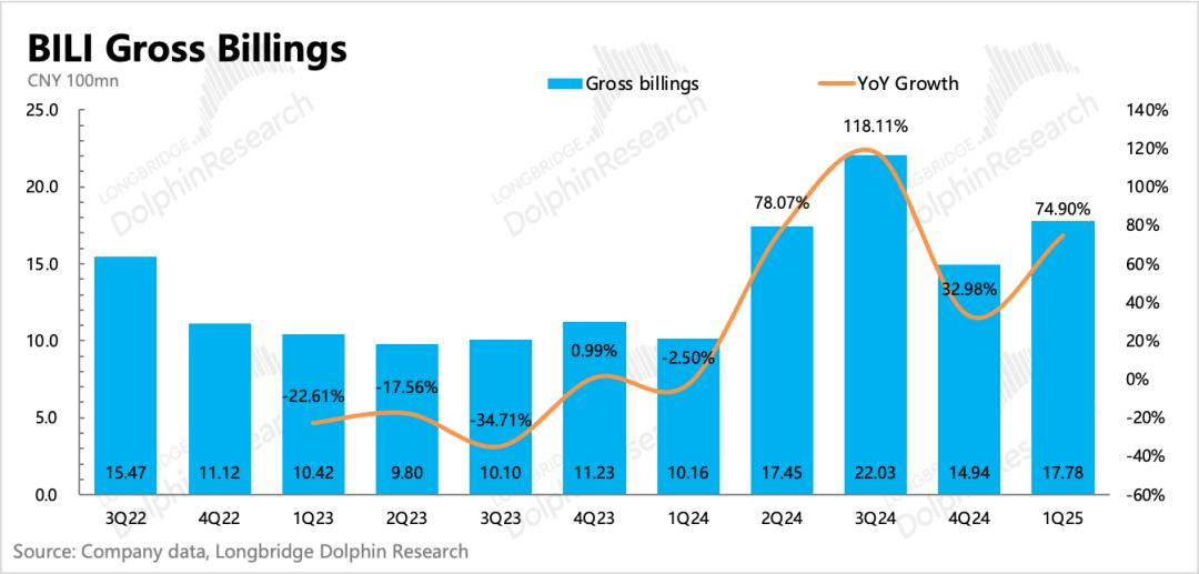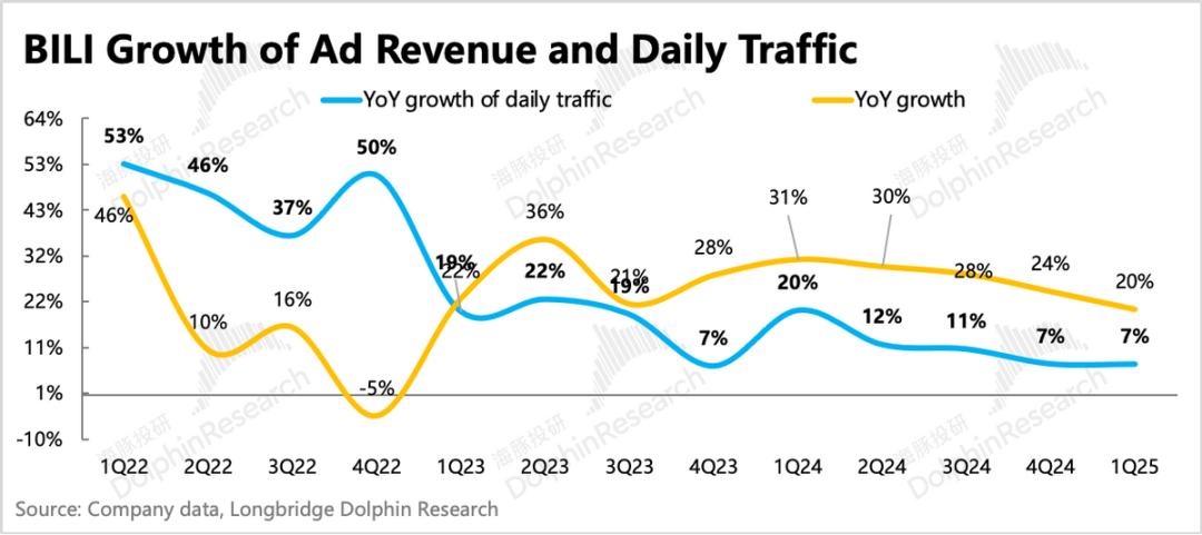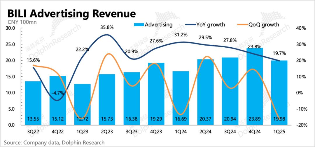 第一季度,哔哩哔哩广告收入近20亿元,同比增长20%。和引导和市场预测完全一样。根据客户时间的主要比例,我们猜测也应该主要是游戏、二次元、AI、国家补充电商持续投资造成的。此外,去年年中推出了全托管工具,第一季度收入增长。