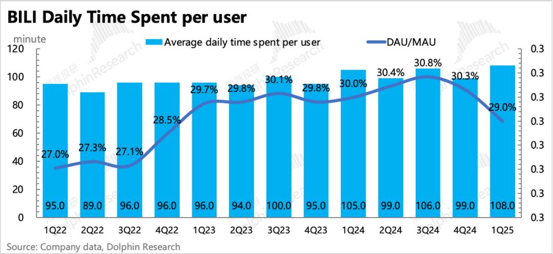 2、使用者的粘性勉强稳定。第一季度DAU达到1.067亿,DAU/MAU达到29%。平均客户时间为108分钟,同比增长3分钟。此外,人均交互量(点赞/评论/收藏)、每日观看视频量分别增加2%、20%。