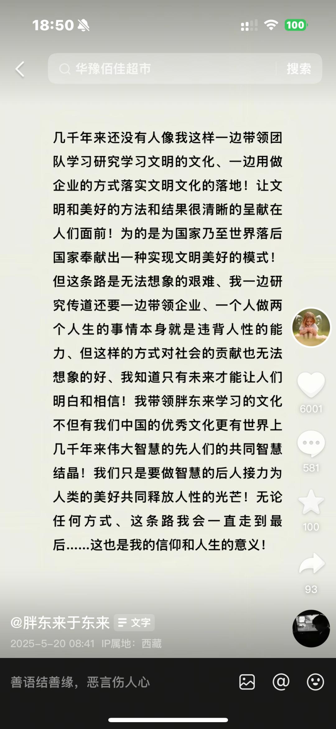 “胖东来不仅仅是为自己说话,更是为所有善良、真诚、有爱心的人而战,让好人不再有死亡的野心,让坏人不再无法无天。”