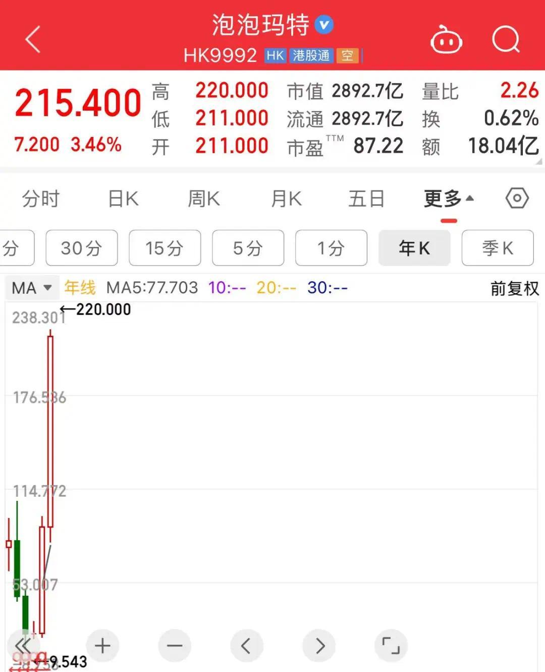 今天上午,泡泡玛特上涨3.46%,股价再次创下历史新高,最新收盘价为215.4港元。摩根士丹利近日发布研究报告,将泡泡玛特的目标价格从204港元上调至224港元,并给予“加持”评级。