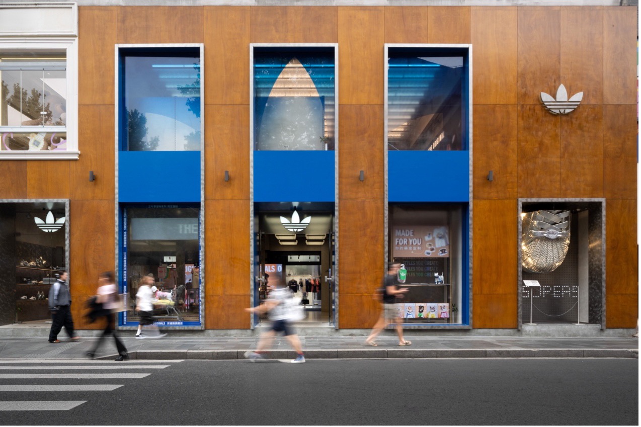 旗舰店建筑的前身是电影院永乐宫。因此,该品牌在门店立面设计中保留了许多旧址的特点,融合了电影院的美学和海派文化。在保留原有建筑结构和立面木饰面的基础上,将经典的三条纹和三叶草标志融入其中,通过三个不同的窗口展示产品。