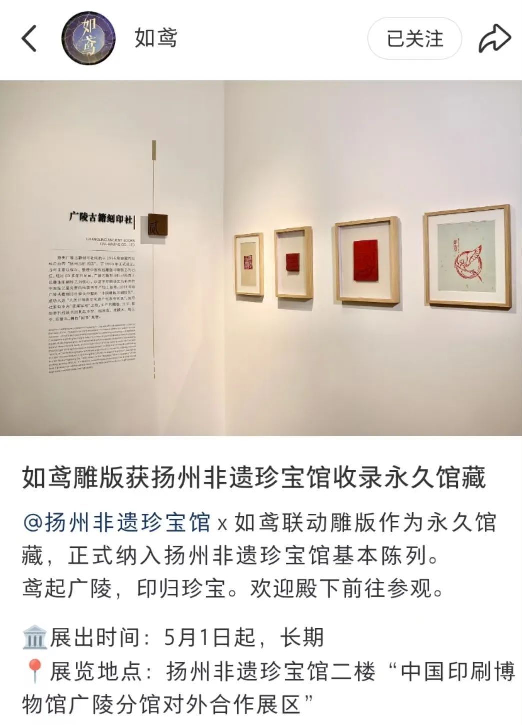 不久前的五一假期,两套雕版印刷作品《如鸢:鸢起广陵》和《如鸢:广陵王玺》正式作为扬州非物质文化遗产珍宝馆的基本展示,展示在场馆二楼的“中国印刷博物馆广陵分馆对外合作展区”,向公众开放。
