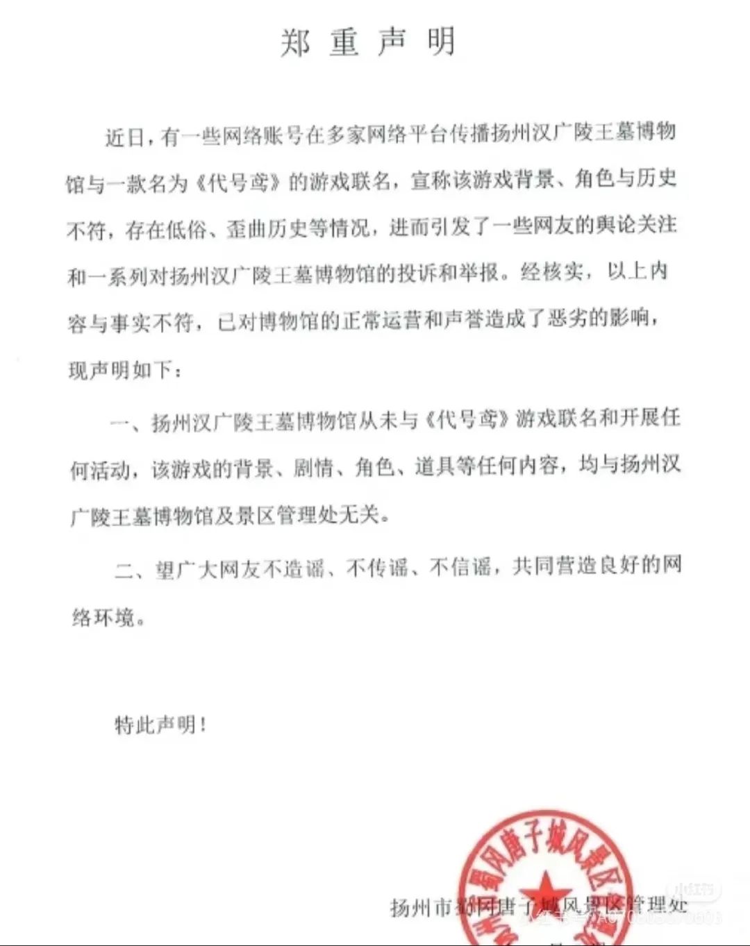随后,博物馆发表声明称与《代号鸢》无关,引起了《代号鸢》粉丝的不满,也让历史爱好者对游戏产生了不好的印象。虽然游戏和扬州在事件发生时没有联名,但也警告游戏和文化旅游官方在选择联名时要谨慎。
