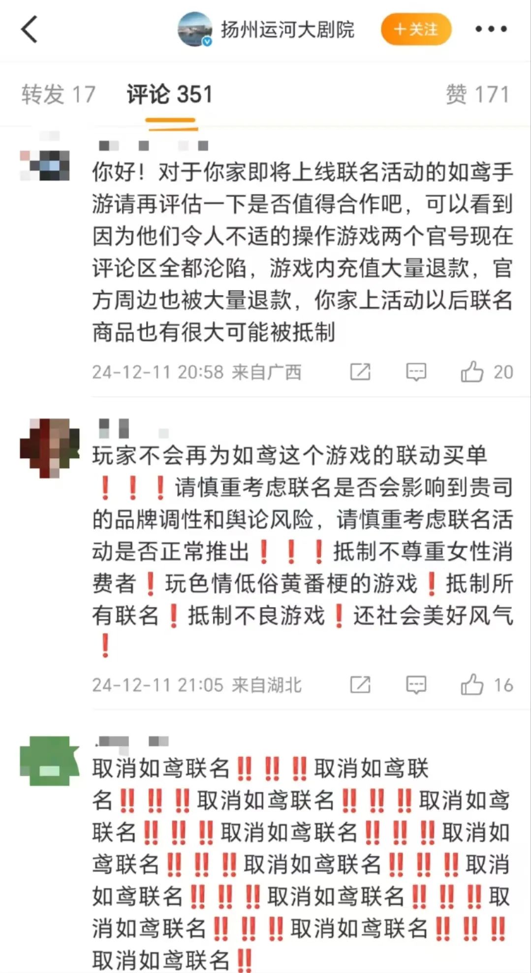 再比如《代号风筝》和《如风筝》因为“侮辱女性”的纠纷引起了玩家的不满,导致玩家放弃了游戏,停止了氪金,并将维权行动延伸到扬州文化旅游官方号评论区,与《如风筝》合作,要求取消联名。这说明如果游戏本身存在不良内容或问题,可能会引起玩家的抵制,从而影响联名文化旅游项目,危害文化旅游项目的形象和声誉。