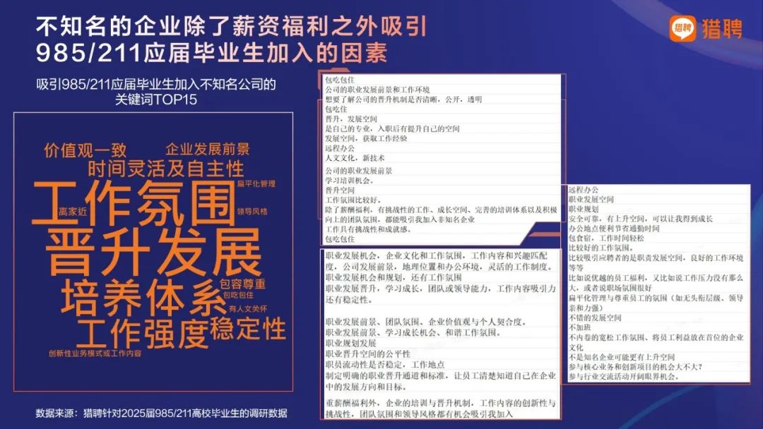 最近对2025届985/211大学毕业生进行的一项调查显示,当被问到“不知名的公司除了薪酬和福利之外,还有哪些因素可能会吸引你加入”时,除工作氛围、晋升发展等回答外,“管吃管住”位列被访者填写的TOP15关键字之一。