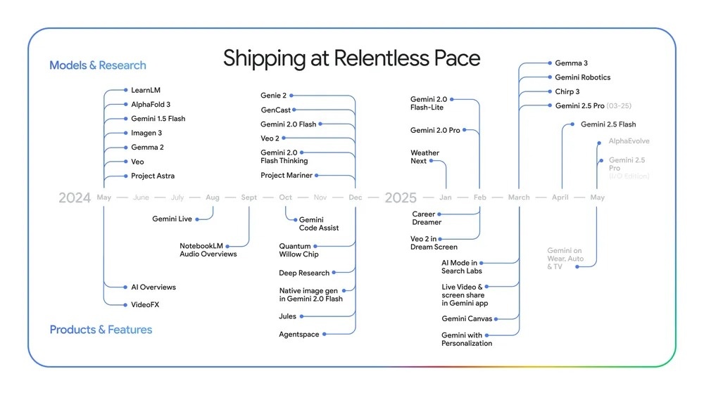 这类模型已融入多种服务,包括搜索,Chrome、Docs、新的创意平台Gmail和Flow、程序员Jules等,几乎涵盖了您在线的所有工作和生活场景。
