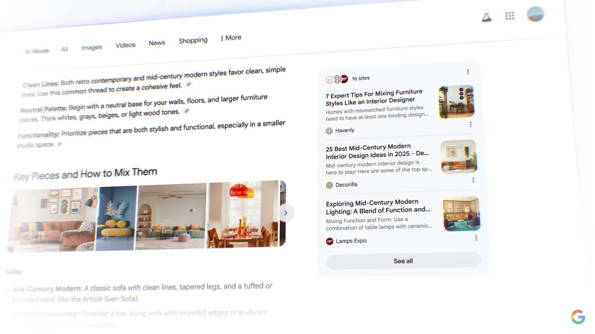 搜索是谷歌的老本行,但在今年的I/O会议上,搜索不再是匹配关键词的工具,而是一个完全重构的“AI助手”。谷歌推出了一种全新的AI模式(AI Mode),与去年相比,这是AI 更进一步的Overview功能进化。
