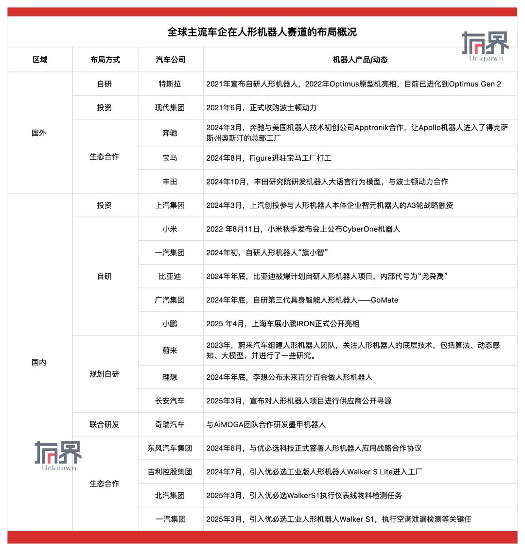 在这些角色中,汽车公司占据了制造“人”的供应链优势和场景合理性,这也使他们对自主研发的人形机器人有信心。