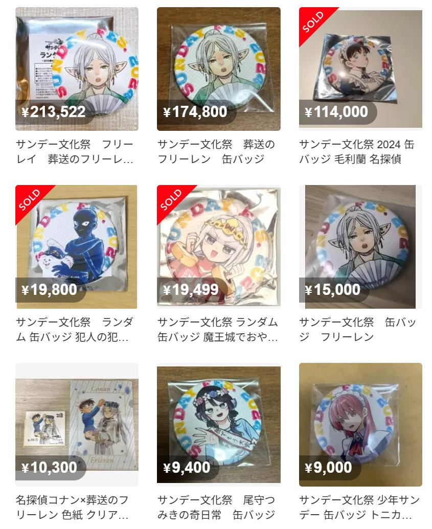 Sunday文化节于去年在小学馆举行,一举推出杂志旗下IP共55个角色的吧唧大混池。虽然选择中心风格的概率低得可怕,但小学博物馆通过其他方式填补了商品的认可度。活动不仅提取了门票,而且盲抽总数也非常有限,每人限购,以至于小学博物馆常青树《名侦探柯南》和新秀《葬送的芙莉莲》两位IP女主角的角色,mercari(煤炉)的成交价格在日本最大的线上二手平台上迅速上涨。