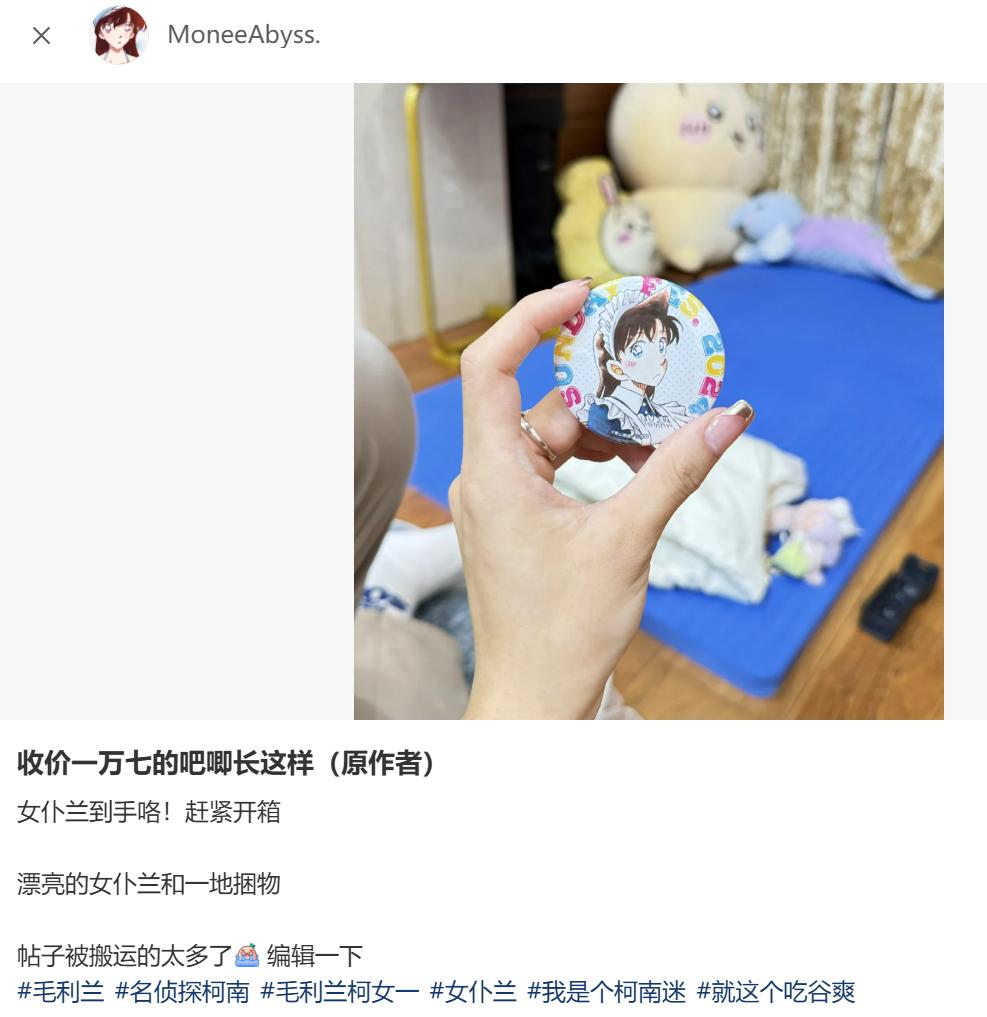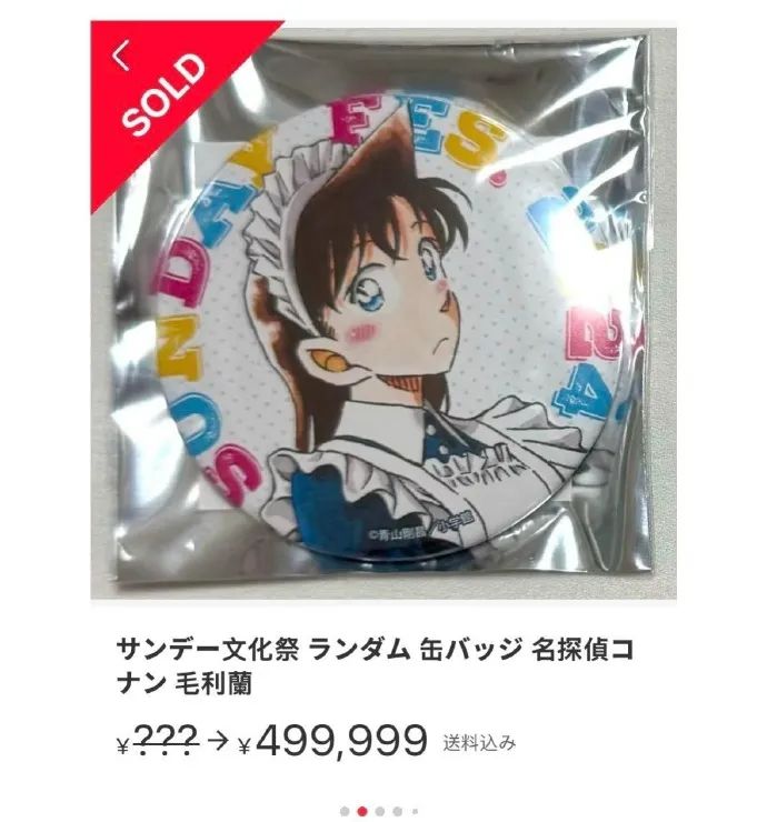 柯南和小黑吧唧2万日元(1000元)就能拿下这一系列《名侦探柯南》,身价翻了一番,但是落地就是暴涨的小兰吧唧,煤炉的最高成交价格已经达到了惊人的49.9万日元(24000元)。即使角色来自同一个IP,差距也是令人瞠目结舌的。