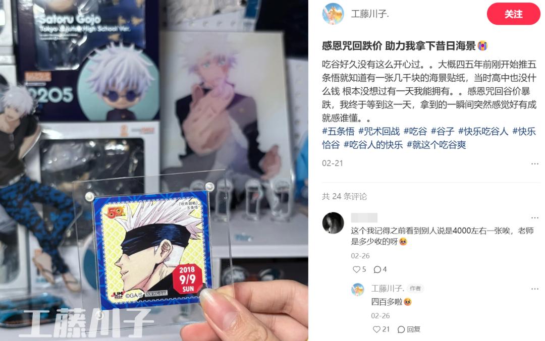 而且日本衍生品市场已经发展了几十年,消费者已经习惯了市场价格的变化。然而,随着国内稻谷经济的兴起,年轻消费者的各种反应都集中在社交平台上。曾经说起谷圈,“纸炒成千上万”、“吧唧过万”等话题引人注目。现在《蓝色监狱》、《排球少年》、《咒语回战》的网友们都在热烈讨论谷价的下跌,这与圈内新一轮的变化相对应。