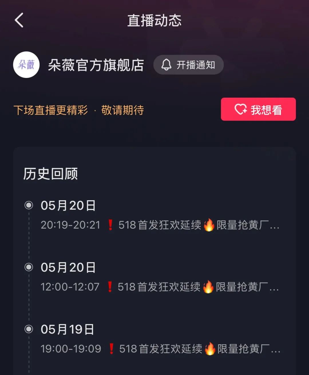 5月19日,朵薇旗靓店发表声明称,限量预购将于每天12:00和晚上7:00打开。从它主页的播出记录可以看出,5月19日中午播出只需要4分钟,晚上播出9分钟,线上产品就卖完了,官方账号只能匆匆播出。