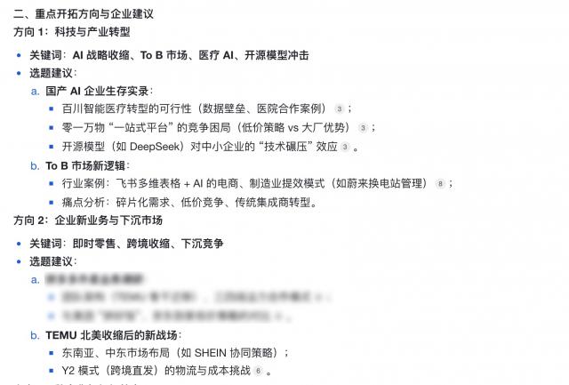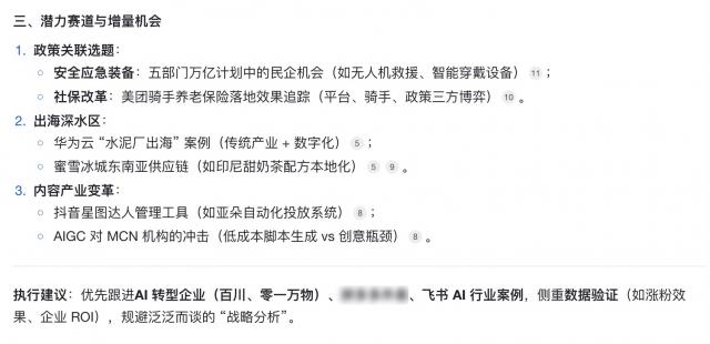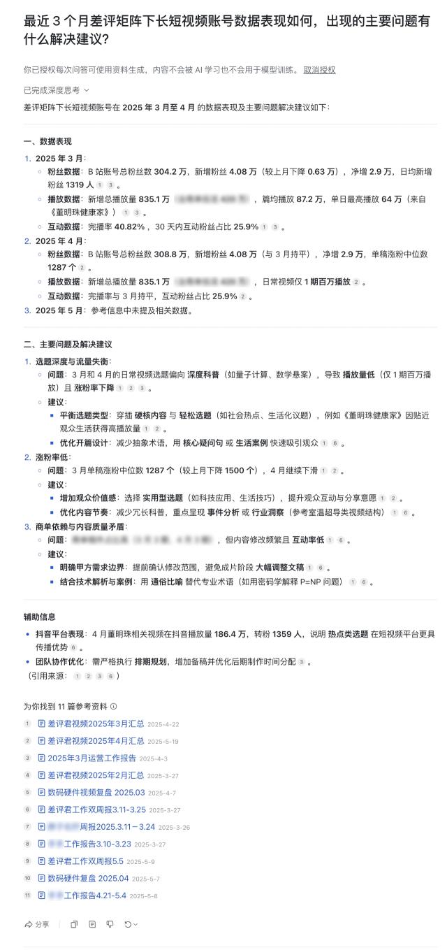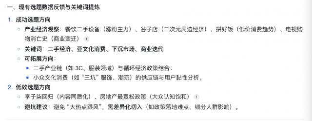 例如 " 整理今年知危编辑部选题,提炼关键字,分析公司或选题方向可以重点开发的公司。 " 其实这类问题的权限要求并不高,但对编辑有重要的参考价值。知识问答的回应不仅给出了成功的选题和低效的选题,也给出了具体的发展方向和建议。