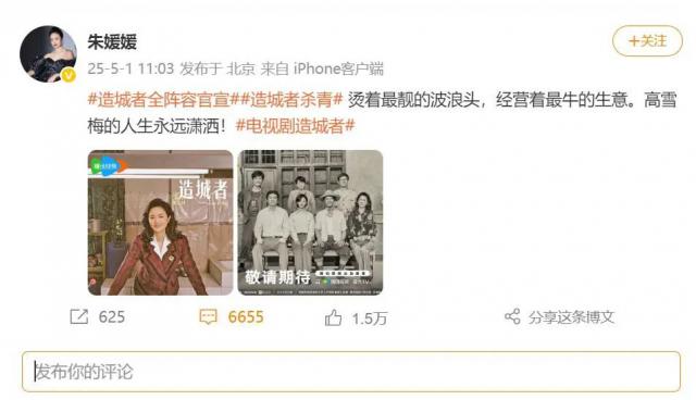 5 月 1 日本,朱媛媛在微博上发布了电视剧《造城者》的宣传。图片 / 朱媛媛社媒