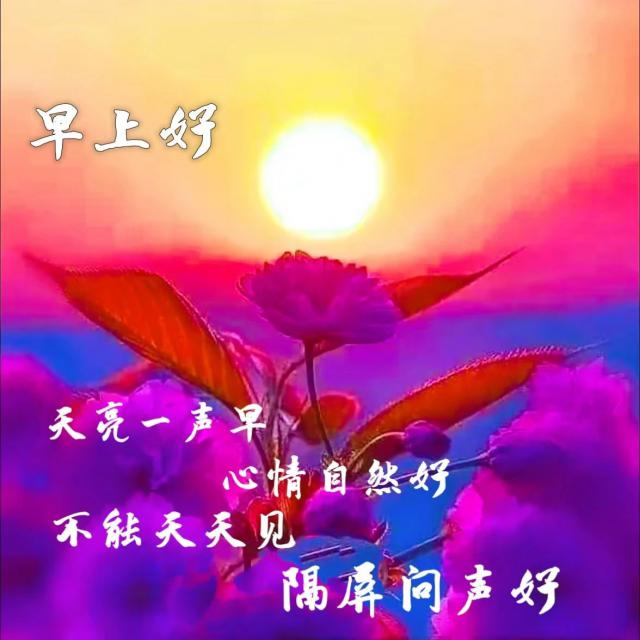 早上到,早上到,早上给你神丹妙药,早上响,头脑清醒,脸上充满晨光,精神好;晨风吹来,苦恼消失;晨露闪闪发光,信心满满。愿你每天快乐,早上好。