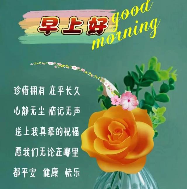 早上好,带着关心,带着问候,带着祝福;每天的问候不是一种方式,而是一种牵挂和关心!只有感恩才能得到,珍惜才能长久!早上好!愿你每天都快乐!