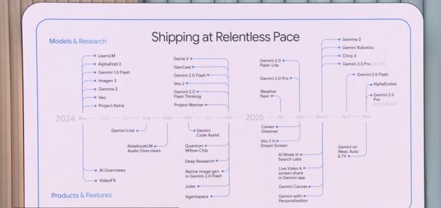 在 AI 在大型模型方面,已经发布 Gemini 2.5 Pro、传播语言模型 Gemini Diffusion、视频生成模型 Veo 3 Flow 应用程序,图像生成模型 Imagen 4 等。硬件方面,分别与三星、Xreal 发布了 Android XR 头显、AR 智能化眼镜等。发布于搜索端 AI Mode 搜索模式、Search Live 等。