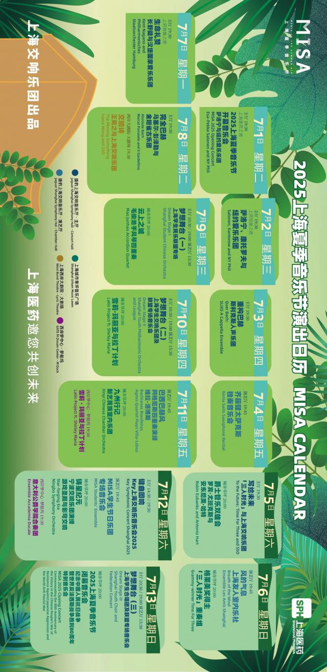 市文化旅游局介绍,2025 夏季音乐会将在上海举行 7 月 1 日至 7 月 13 日举办。今年 MISA 以“写给未来”为主题,用音乐的力量帮助环保工作。届时,4 支持职业交响乐团,7 音乐组合,多个学生艺术团体,近距离 50 位置指挥和独奏艺术家将聚集在一起 MISA,以 29 现场表演,20场 余场线上直播为市民提供了更加多样化、沉浸式的主题感受,共同度过。 MISA、有音乐第 16 个盛夏。详细↓
