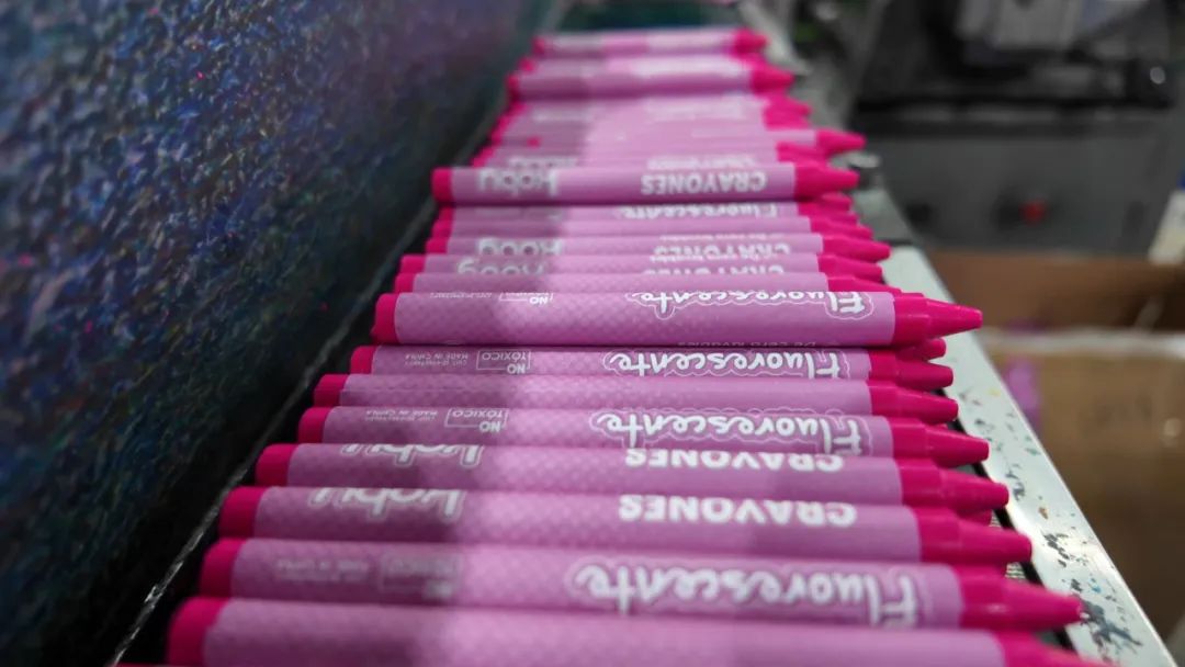在乐绘艺术的生产车间里,流水线正源源不断地导出成品蜡笔。公司总经理周理平详细介绍了生产工艺:每支蜡笔需要经过调味、成型、贴标、包装、成品五个步骤。根据不同客户的需求,调料阶段的生产配方各不相同。工作人员将颜料、硬脂酸、石蜡等原材料按照既定比例放入搅拌锅中,经车间主任核实后启动搅拌程序。搅拌均匀的材料将被输送到楼下的生产线上。由于此时混合物料温度较高,需要借助冷水持续降温,使其从55℃降至20℃左右,然后基本完成凝结成型。周理平说:“我们可以用不同形状的模具制作各种形状的蜡笔。”最终,经过贴标和包装工艺的蜡笔,成为可销售的成品。