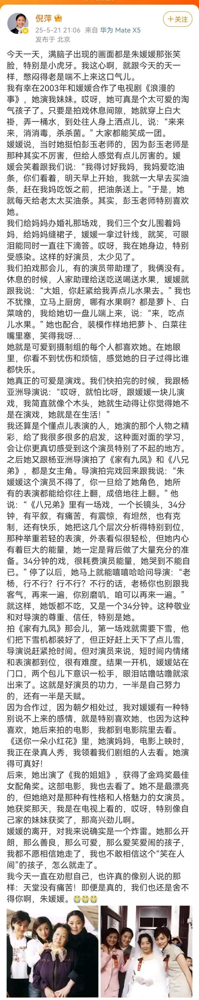 5 月 21 白天晚上,倪萍发千字长文哀悼朱媛媛: “今天的一天,我脑海中所有的场景都是朱媛媛的笑容,尤其是小虎牙。我的心,就像今天的天空一样,我太无聊了,无法呼吸。”