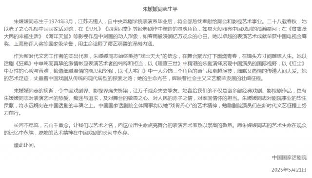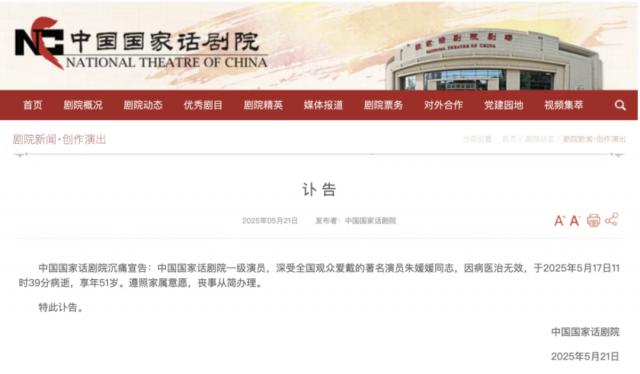 中国国家剧院沉痛宣布:中国国家剧院一级演员朱媛媛同志,深受全国观众喜爱,因病治疗无效,因病治疗无效, 2025 年 5 月 17 日 11 时 39 分病,享年 51 岁月。按照家人的意愿,从简单处理丧事。