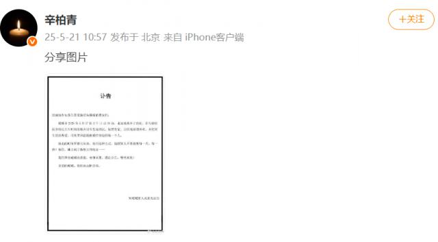 5 月 21 日,辛柏青发布妻子朱媛媛去世的通知,“媛媛于于于媛。 2025 年 5 月 17 日早上 11 点 39 分,永远离开我们。”辛柏青还表示会尊敬朱媛媛的想法,丧事从简,他自己也把微博的头像换成了蜡烛的照片。