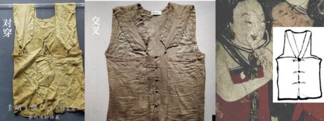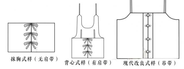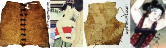 从文物可以明显看出,这种款式会有围兜,也可以没有围兜,围兜可以穿也可以穿(右下图),可以看出其束缚的灵活性和时尚性;没有肩带的也可以归为裹胸,但宋明时期常见的裹胸多为一片式绑带式,而主腰则为对开式。