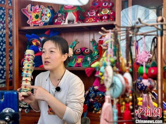 “黄土造物”直播间甘肃庆阳市主播介绍端午节“五彩花绳”产品。中新社记者 闫姣 摄