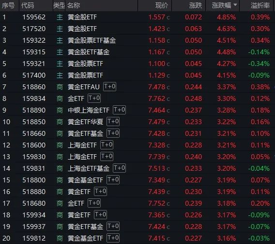 在黄金价格暴涨的推动下,黄金概念股活跃起来,西部黄金尾盘涨停,老店黄金、灵宝黄金、四川黄金、赤峰黄金涨幅超过5%。ETF(交易型开放指数基金)方面,有20只相关产品单日涨幅超过3%。具体来说,6只黄金股ETF涨幅超过4%,同类产品领涨,14只黄金股ETF涨幅超过3%。