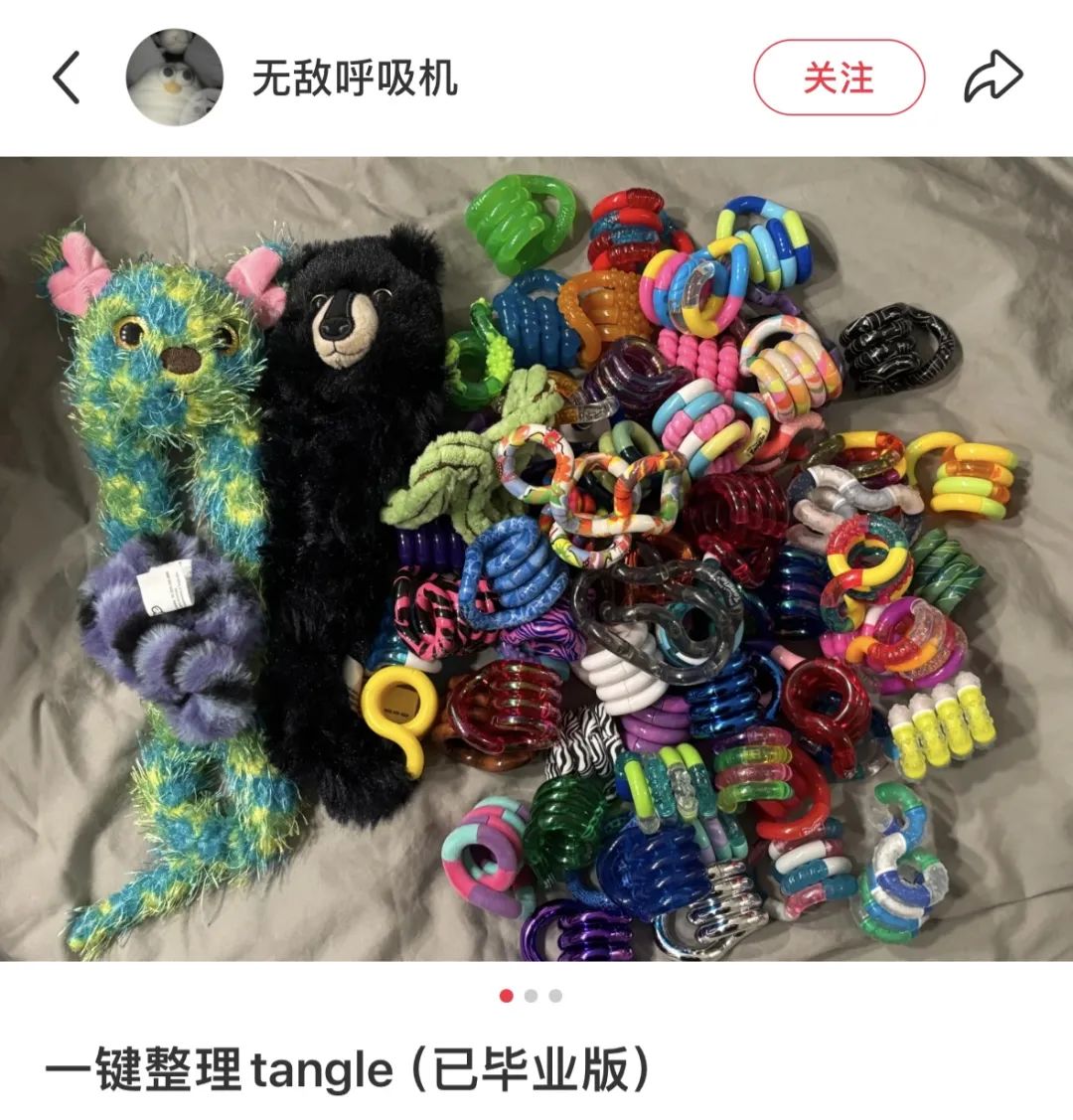 跟随它的盘友开始显露出来。“颜值控制”,一边骂丑东西,一边被明星晒图所左右,狠狠地买下来,。Tangle的不同系列拆解重构为Tiffany蓝,颜色相互组装,玩混搭。一些年轻女孩爱好者把Tangle当作手镯、choker项圈、吊坠和配饰。治愈玩具与审美主义相结合,成为穿着不可或缺的一部分。它不是一个功能性的小商品,而是一个新的人体器官啊!
