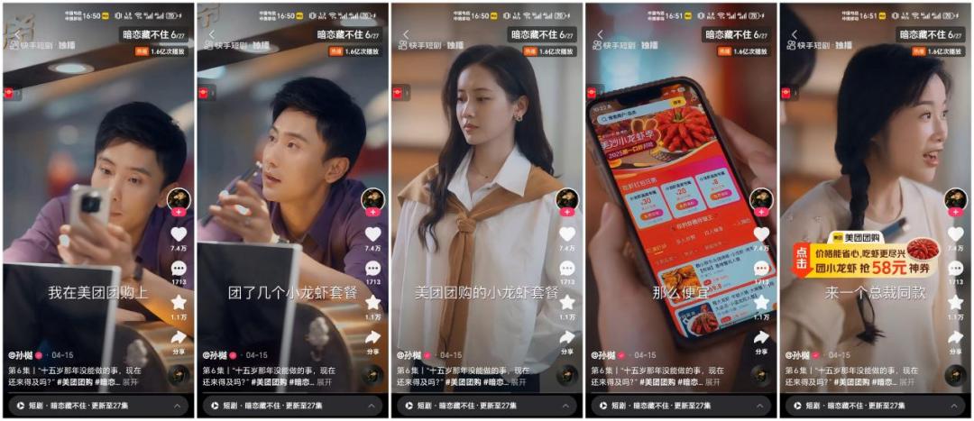 通过与快手达人的深度绑定,美团 《暗恋藏不住》独自在短剧演员孙邈的Aautorapp账号播出,同时在Aautorapp下载网页、短剧播放页面等关键资源位置曝光。用户观看时,可以直接点击屏幕边缘的美团团购链接抢购套餐,实现“内容-转换”的无缝连接。