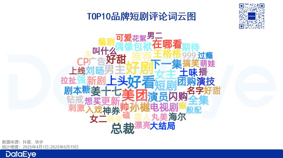 从品牌推广的角度来看,美团品牌讨论的声音更大。一方面,美团制作的5部短剧是互动量TOP10,另一方面,从抓取的评论来看,“美团”是仅次于“短剧、美观、推荐”等词语的最高品牌词条。