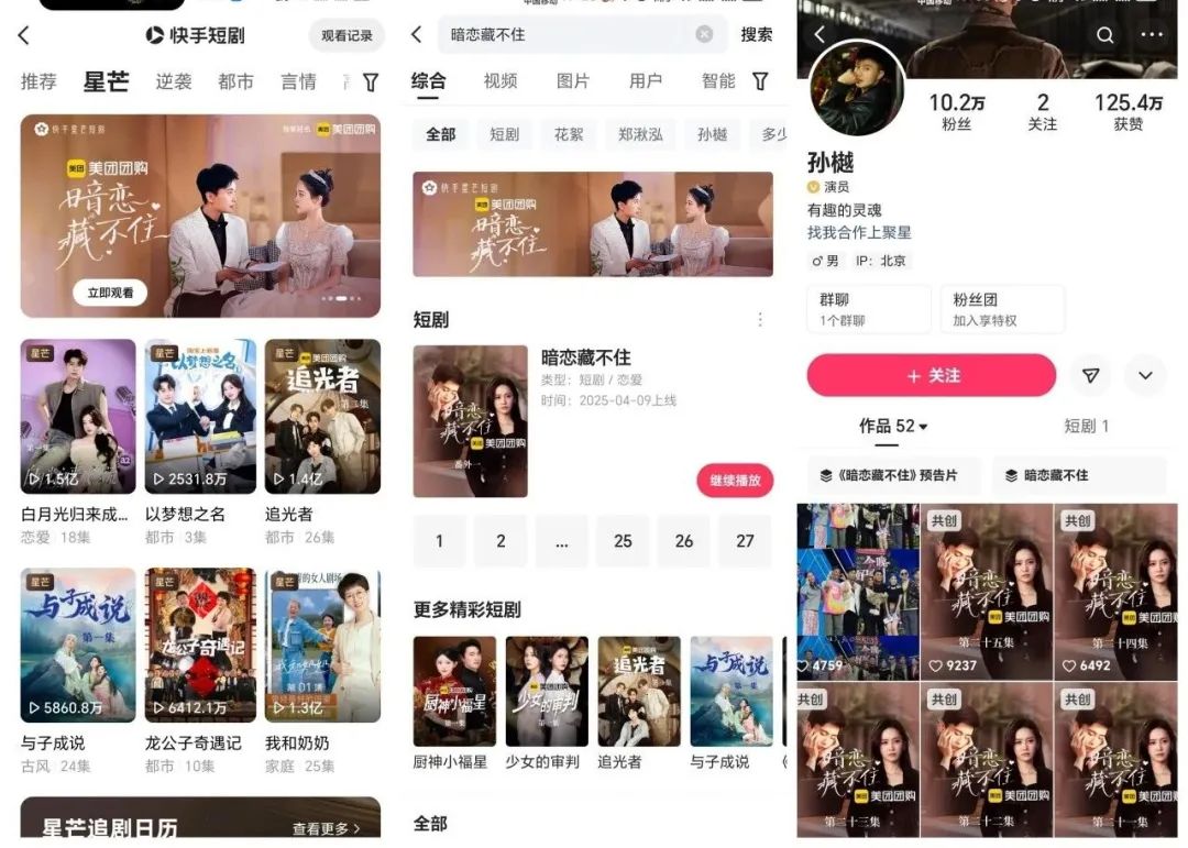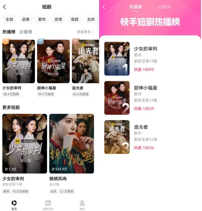 而且从快手APP中的热门榜单来看,美团团购出品的三部短剧更是霸榜TOP3,快手的热度都超过了万。