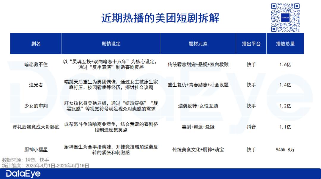 从美团近期热播的5部突破1亿元的短剧来看,结合最新的社会热点话题,在市场验证的主题上创作人设是一种切实可行的内容方法论。