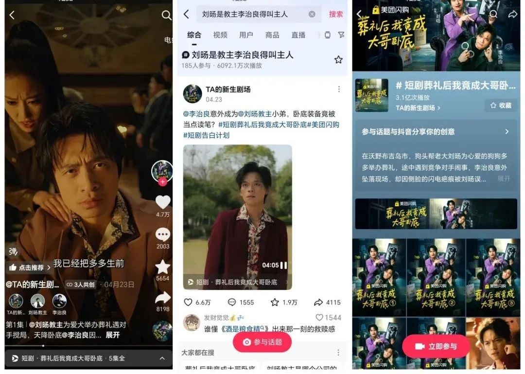 而且在抖音端,美团与抖音剧院号TA的新剧院合作制作。 “葬礼结束后,我成了大哥卧底”,与颤音喜剧演员联动,鼓励用户通过话题互动进行二次创作。相关话题播放量达到3.1亿,实现了从内容破圈到兴趣传播的传播链接。
